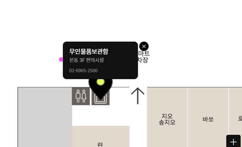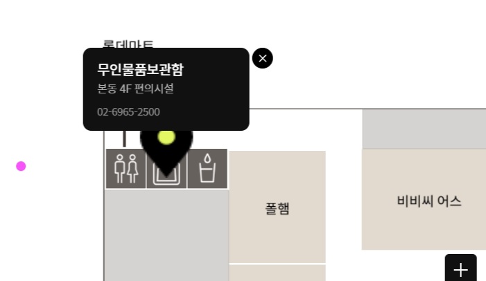 위치: 2층 샘소나이트와 플레이스 매장 사이 통로, 3층 정문 앞(린 매장과 지오송지오 매장 사이), 4층 정문 앞(폴햄 매장 옆 쪽 통로)
