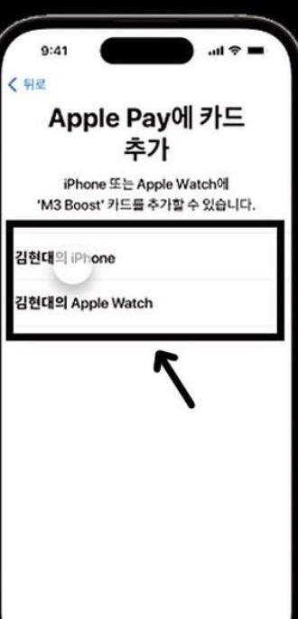 아이폰에서 애플 워치 앱을 열고 나의 시계를 탑한 후 지갑 및 Apple Pay를 탭합니다. 다른 Apple기기에 카드가 있거나 최근에 삭제한 카드가 있는 경우, 추가할 카드 옆에 있는 추가를 탭하여 준 후 해당 카드의 뒷 면에 있는 CVV번호를 입력하시면 됩니다.