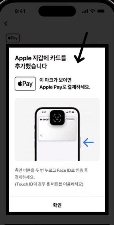 오른쪽 측면 버튼(전원 버튼)을 2번 연속으로 클릭하시면 자신이 등록한 카드가 나오고 Face ID를 인식해준 후 리더기에 갖다 대면 결제가 완료됩니다.